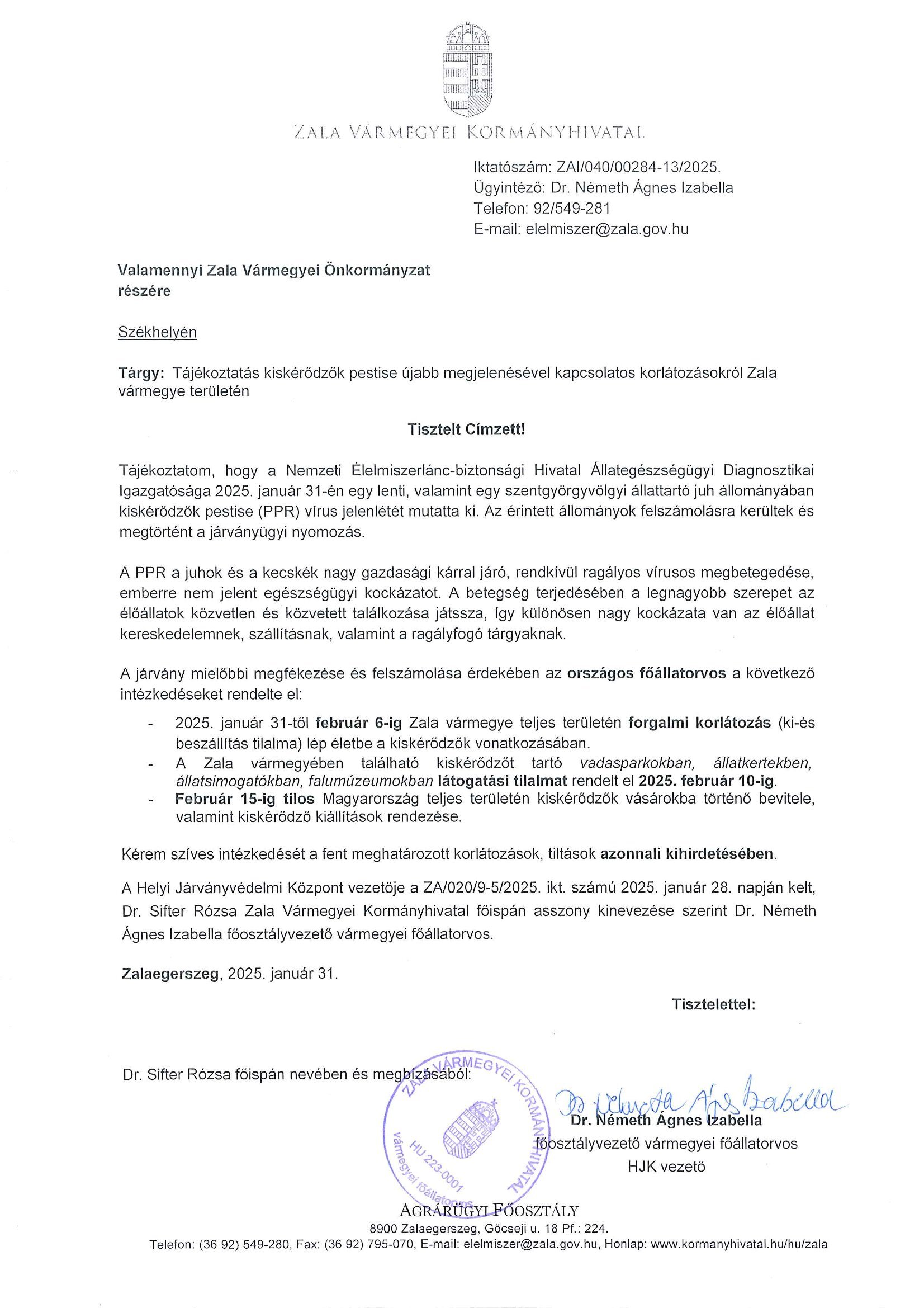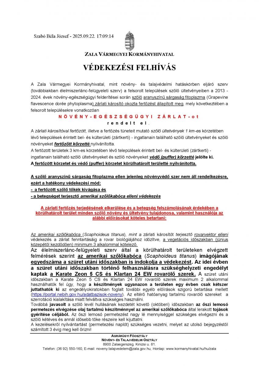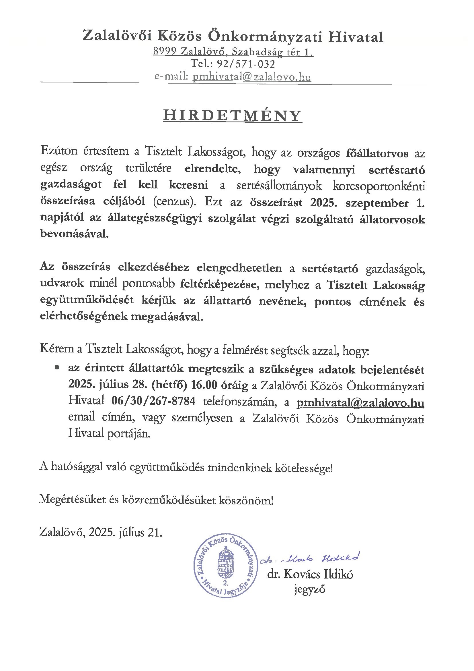 A Zalalövői Közös Önkormányzati Hivatal Jegyzője értesíti Zalalövő város, Csöde és Keménfa község lakosságát a Zala Vármegyei Katasztrófavédelmi Igazgatóság felhívásáról: