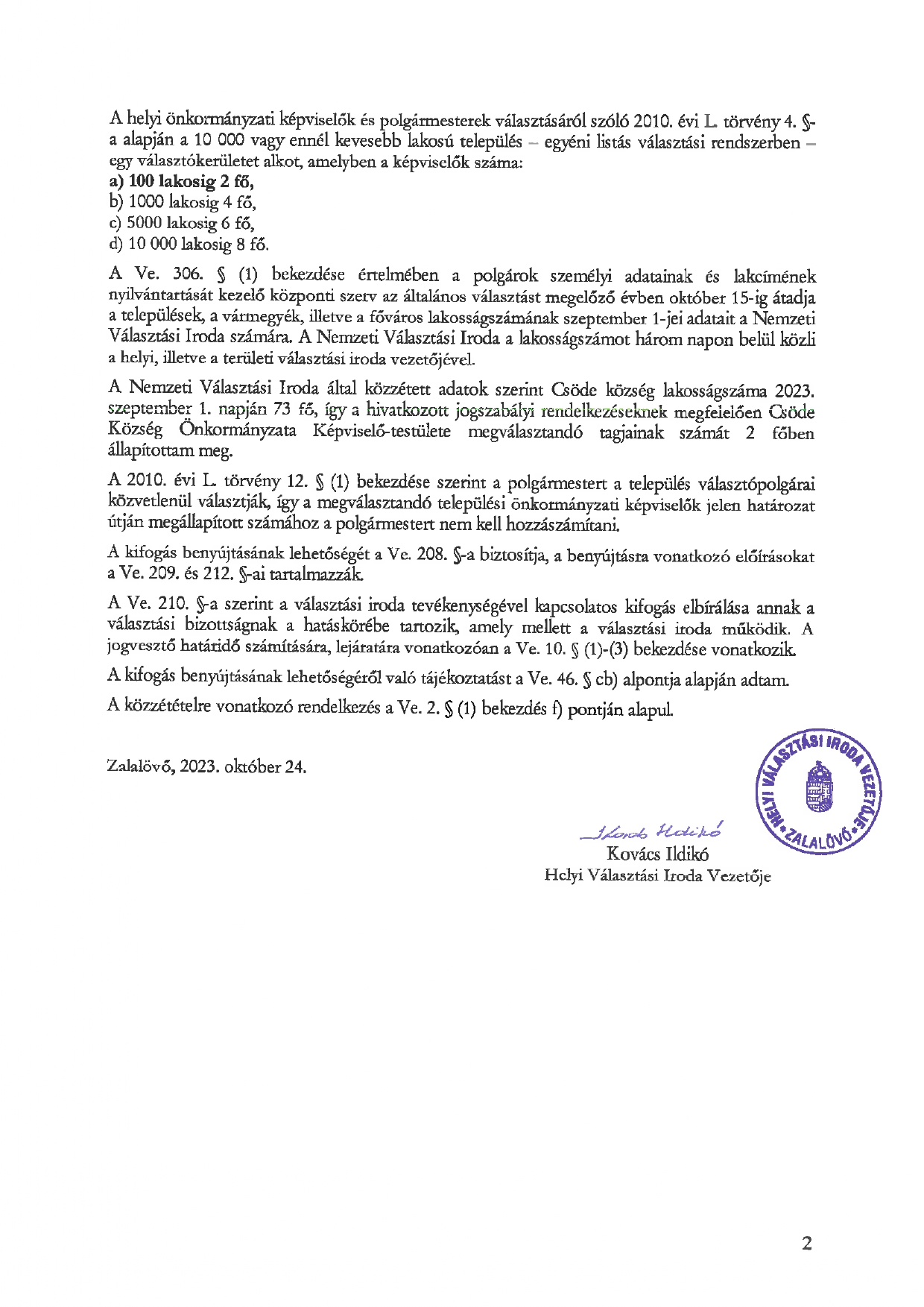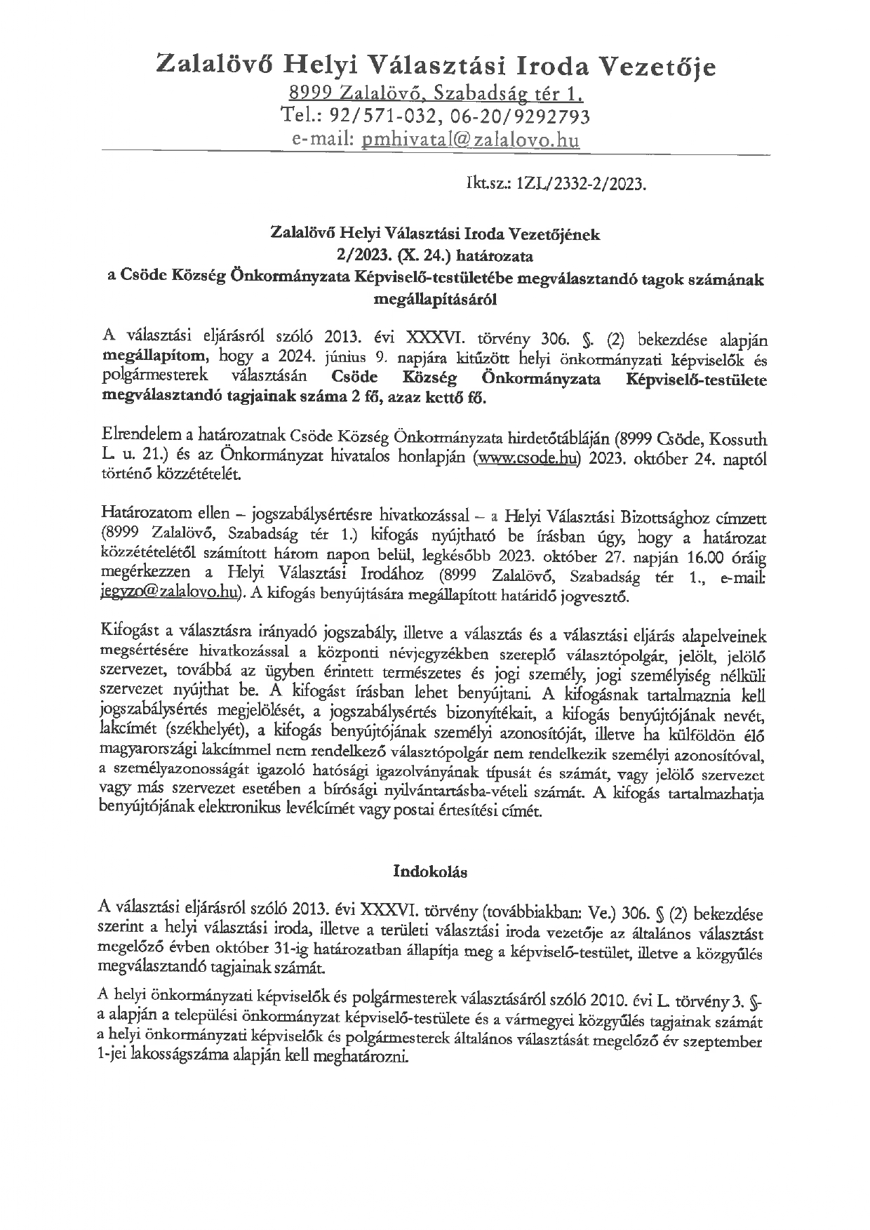Zalalövő Helyi Választási Iroda Vezetőjének 2/2023 (X.24.) határozata